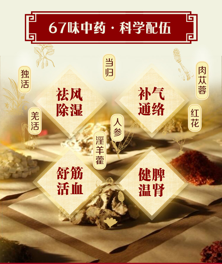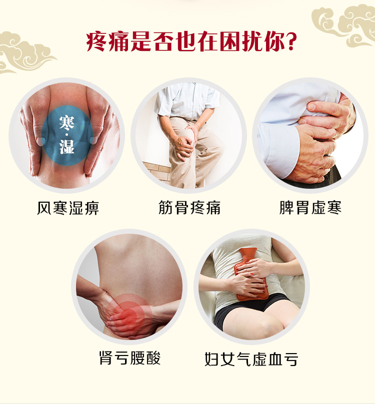 【功能主治】 祛风除湿、补气通络、舒筋活血、健脾温肾。用于风寒湿痹、筋骨疼痛、脾胃虚寒、肾亏腰酸及妇女气虚血亏。
