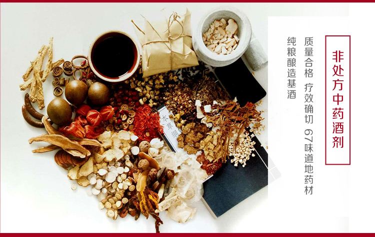 【成份】 制何首乌、地黄、白芷、山药(炒)、五倍子、广藿香、人参、桑白皮、海桐皮、甘松、独 活、苍术(炒)、川芎、菟丝子(盐炒)、茯神、青皮(炒)、草果、山茱萸(去核 )、附子(制)、厚朴、陈皮、五味子、牛膝、枳实(炒)、高良姜、山柰、款冬花、小茴香(盐炒)、桔梗、熟地黄、九节菖蒲、白术(炒)、槟榔、甘草、当归、秦艽、红花、莪术、莲子(去心)、木瓜、麦冬(去心)、羌活、香附(炒)、肉苁蓉、黄芪、天冬 、桃仁、栀子(炒)、泽泻、乌药、半夏(制)、天南星(制)、苦杏仁(去皮尖)、茯苓、远志、淫羊藿(炒)、三棱(醋制)、茜草、砂仁、肉桂、白豆蔻、红豆蔻、荜茇、沉香、豹骨、人工麝香、红曲。辅料为白酒、红糖、冰糖。