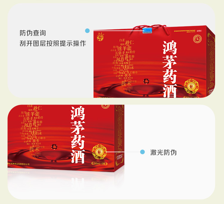 关于线上销售250ml鸿茅药酒说明 鸿茅药酒仅有250ml、500ml两个规格是经过国家药监局批准的,产品原料生产出厂运输直至销售全程可追溯,产品配方,品质完全一致。250ml产品是鸿茅药酒历经3年调研,根据线上用户需求设计的专属产品。250ml产品携带方便,运输更快捷,安全又放心。礼盒包装 更加精美贴心